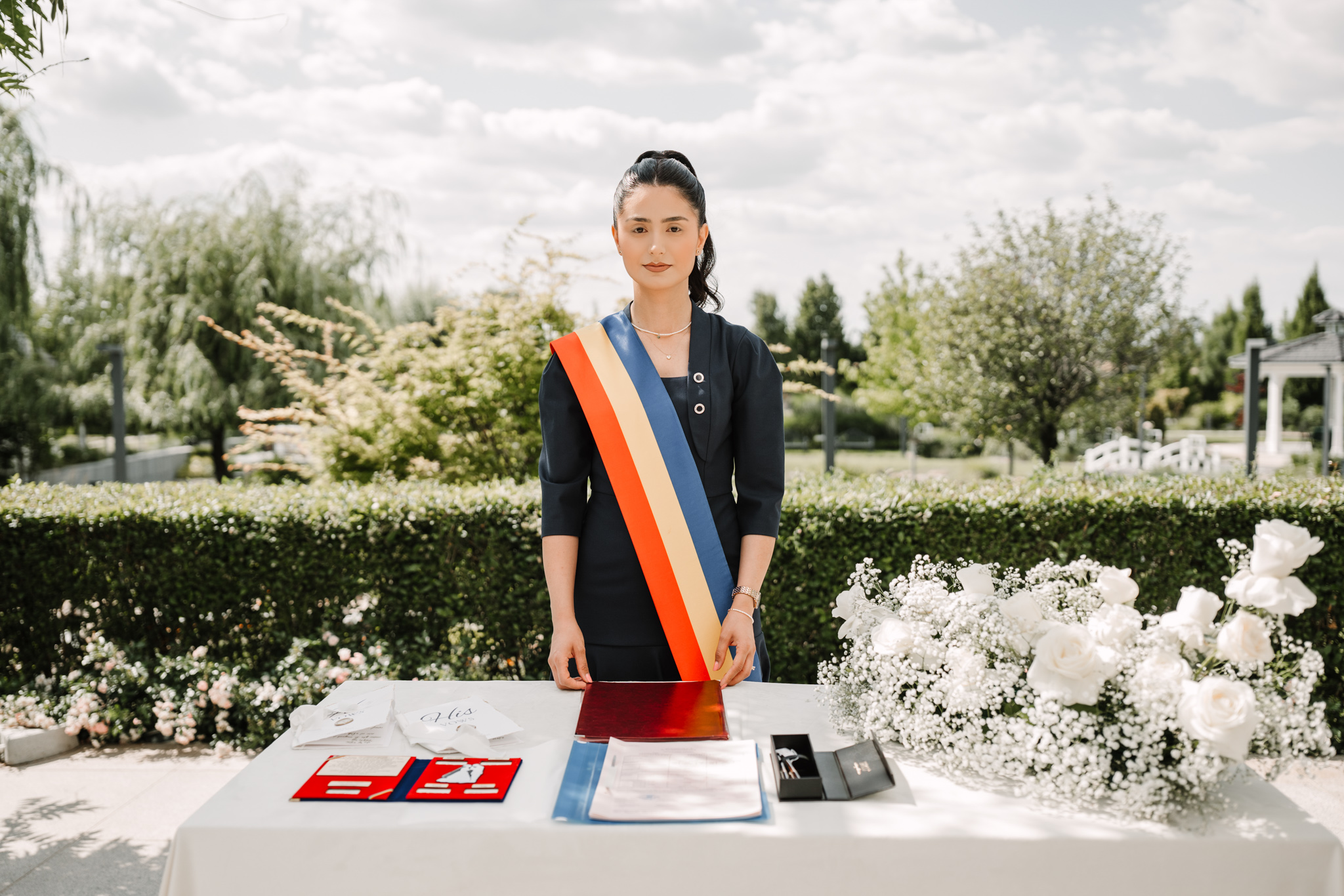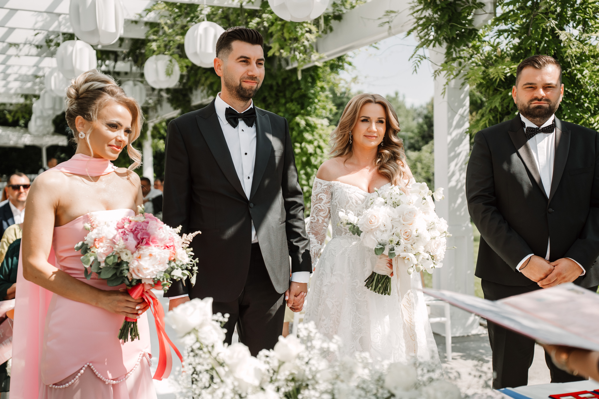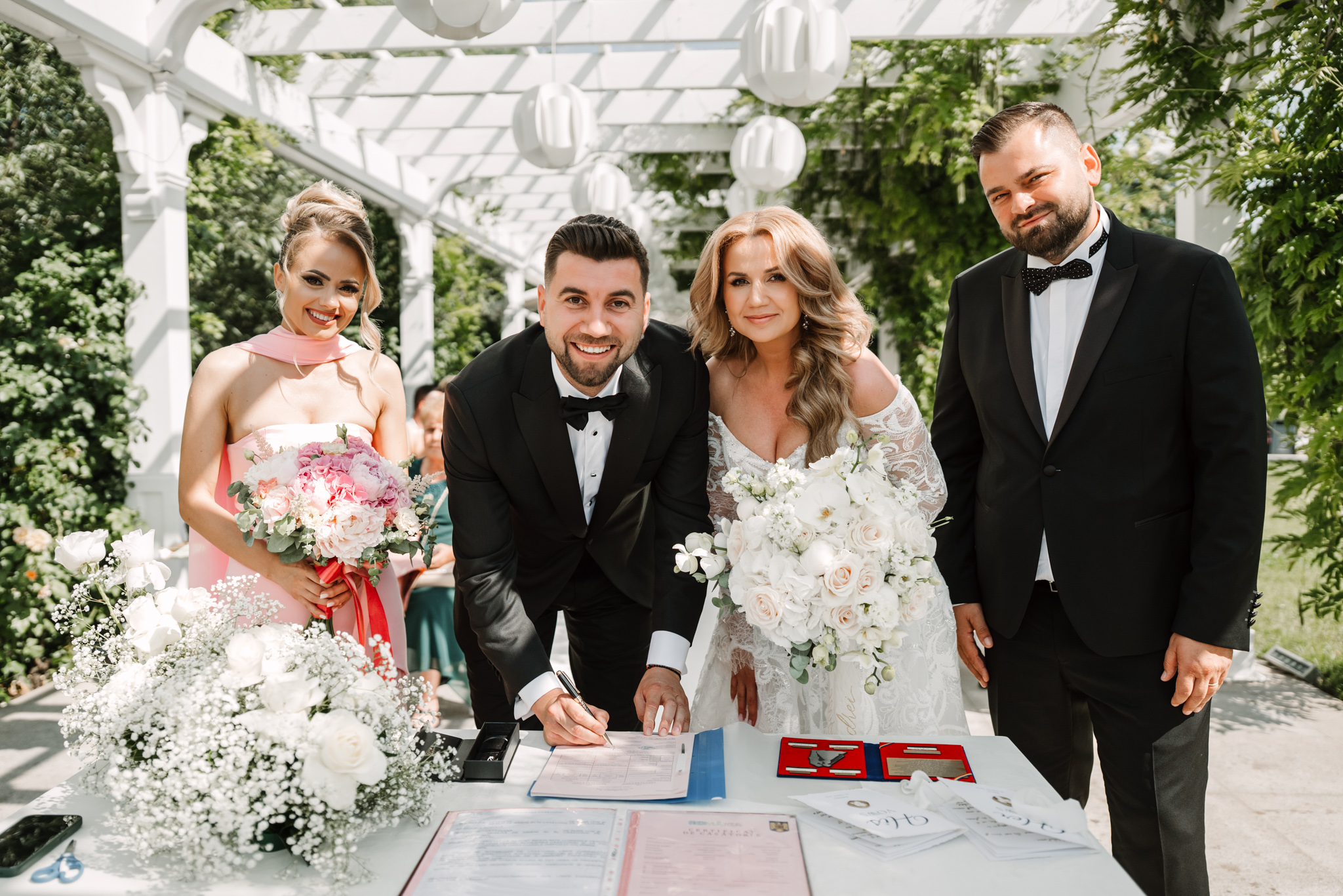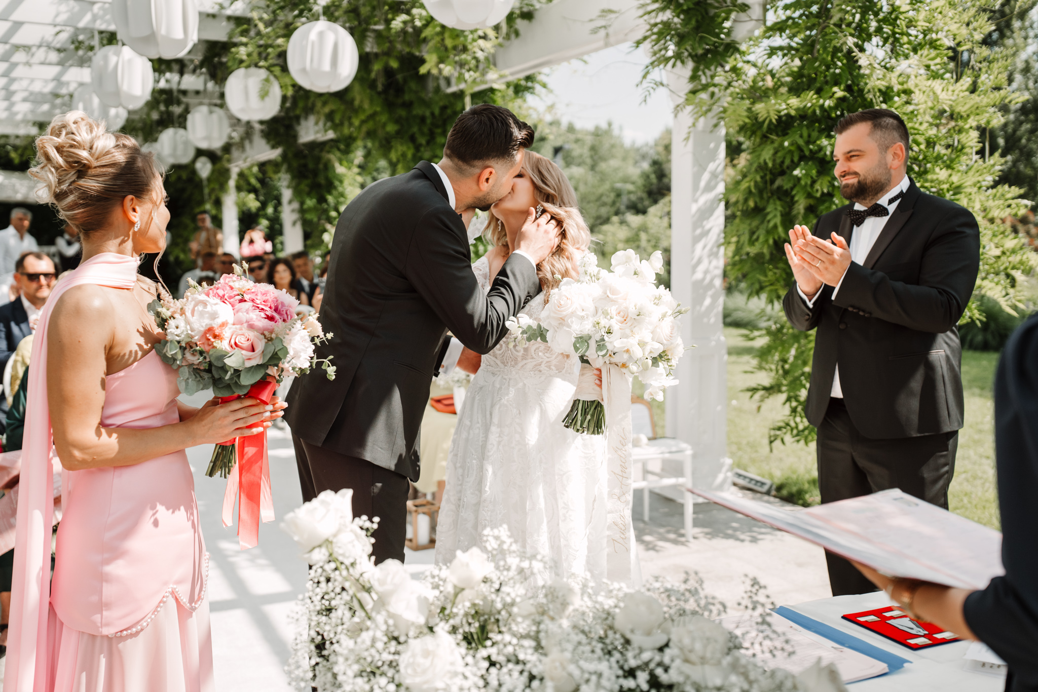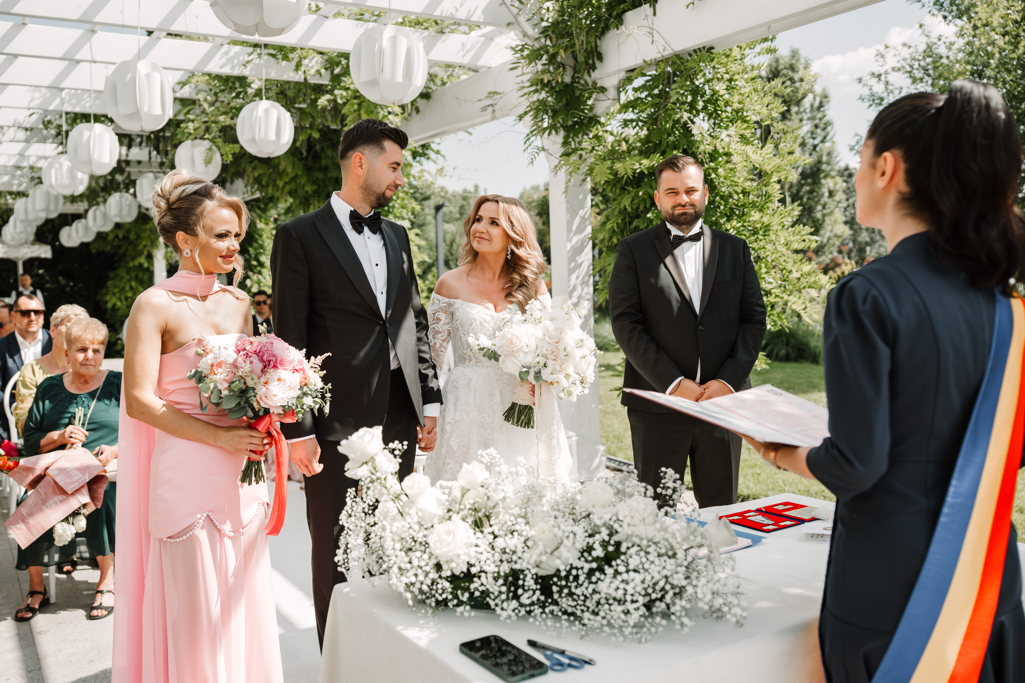 Ceremonia s-a ținut afară, între zone verzi și aranjamente florale. Dacă vrei să vezi exemple reale de fotografie de cununie civilă în București, îți recomandăm și nunta Andreei & Jonathan la Pădurile Regale.