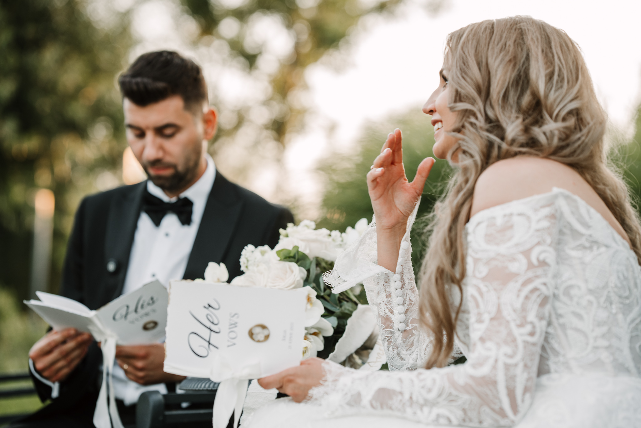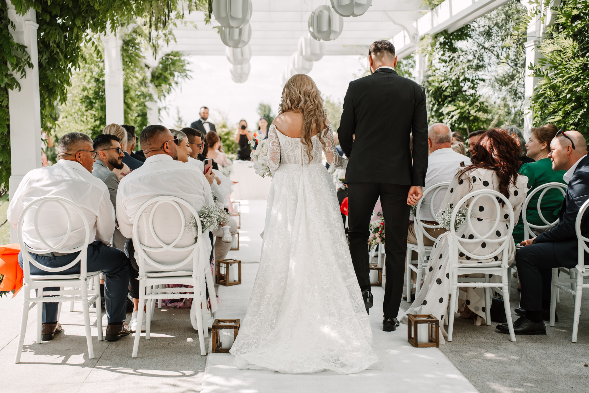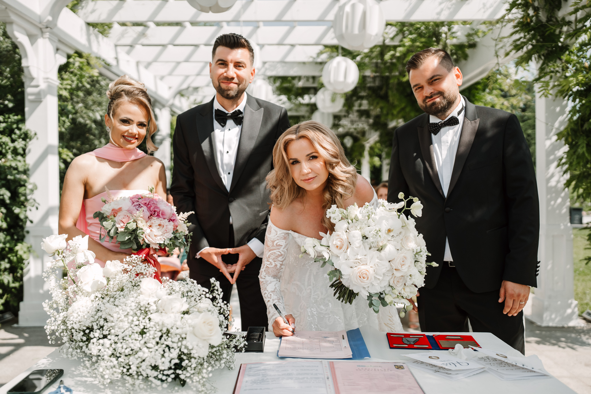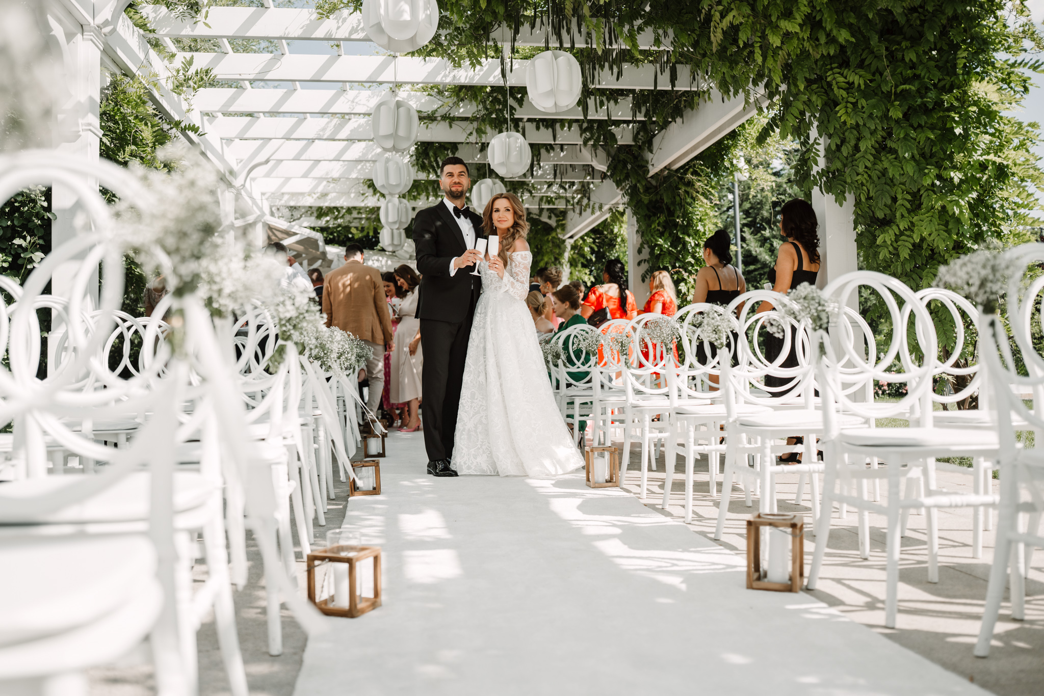 Ceremonia s-a ținut afară, între zone verzi și aranjamente florale. Dacă vrei să vezi exemple reale de fotografie de cununie civilă în București, îți recomandăm și nunta Andreei & Jonathan la Pădurile Regale.